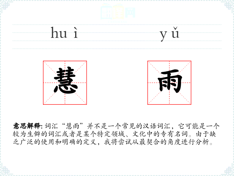 词汇“慧雨”并不是一个常见的汉语词汇,它可能是一个较为生僻的词汇或者是某个特定领域、文化中的专有名词。由于缺乏广泛的使用和明确的定义,我将尝试从最契合的角度进行分析。