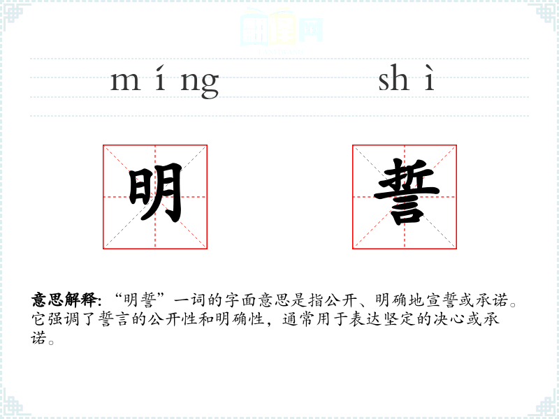 “明誓”一词的字面意思是指公开、明确地宣誓或承诺。它强调了誓言的公开性和明确性,通常用于表达坚定的决心或承诺。