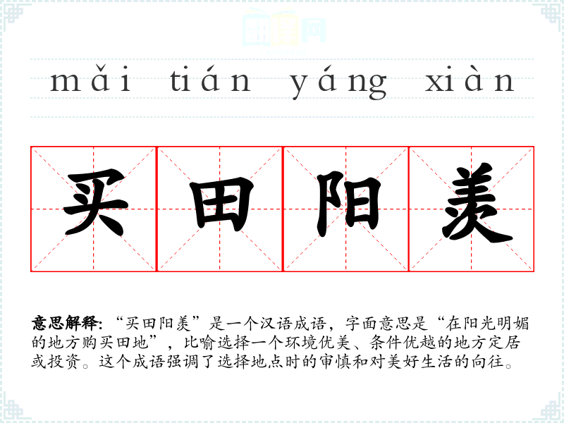“买田阳羡”是一个汉语成语,字面意思是“在阳光明媚的地方购买田地”,比喻选择一个环境优美、条件优越的地方定居或投资。这个成语强调了选择地点时的审慎和对美好生活的向往。
