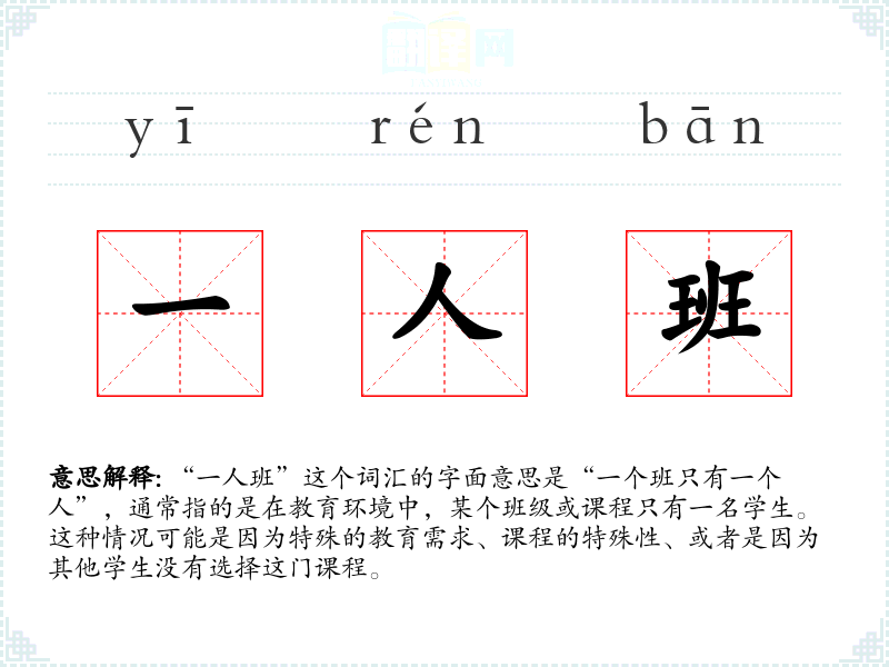 “一人班”这个词汇可能是近年来随着个性化教育和特殊教育需求的增长而逐渐被广泛使用的。它直接来源于对教育模式的描述,没有复杂的词源历史。
