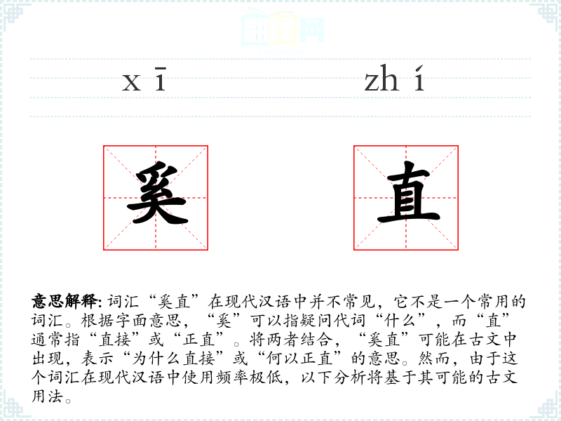 - 反义词:无(由于“奚直”不常用,反义词不明显)