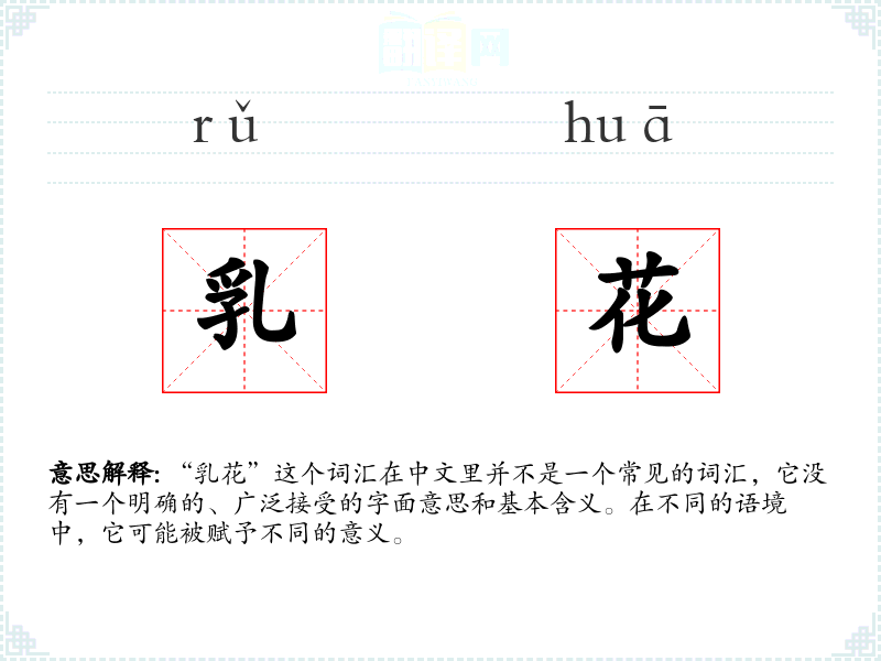 由于“乳花”不是一个标准词汇,它在不同语境下的使用非常有限。在某些特定的文学作品或方言中,它可能被用来形容某种与乳制品相关的花状物,或者是一种比喻用法,用来形容某种细腻、柔软的质感。