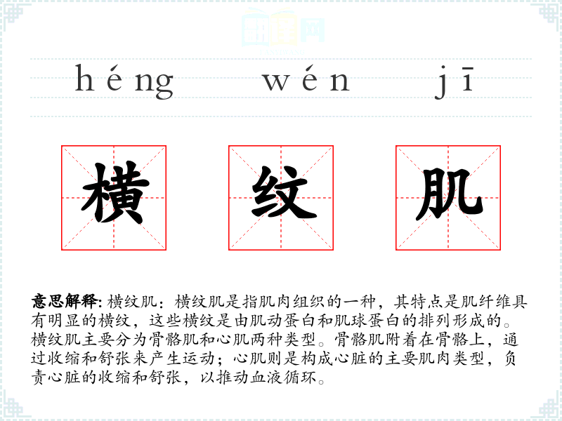 词源:横纹肌这个词来源于拉丁语“musculus”(肌肉)和“striatus”(有条纹的)。在19世纪,随着解剖学的发展,这个词被引入科学术语中。