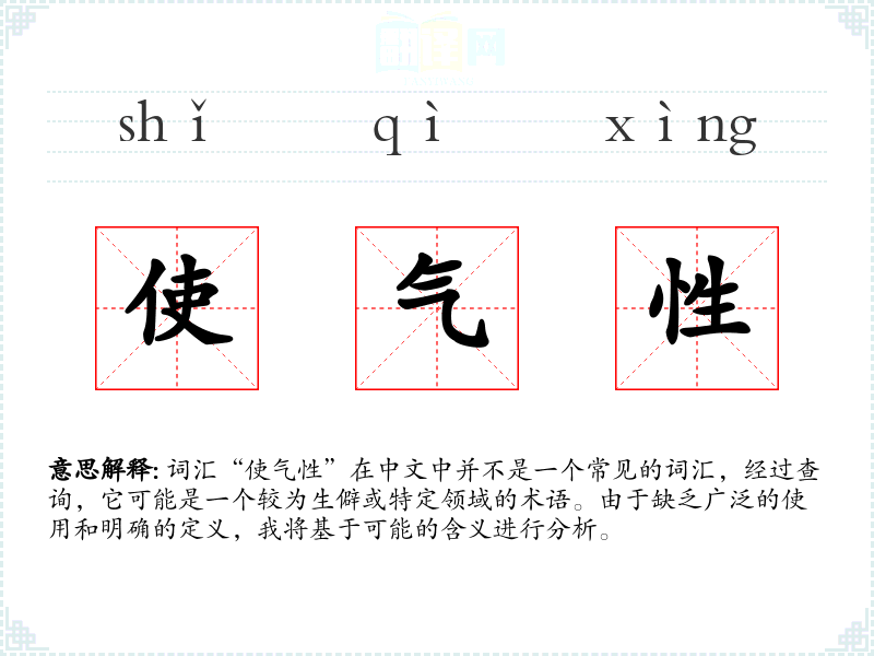 词汇“使气性”在中文中并不是一个常见的词汇,经过查询,它可能是一个较为生僻或特定领域的术语。由于缺乏广泛的使用和明确的定义,我将基于可能的含义进行分析。