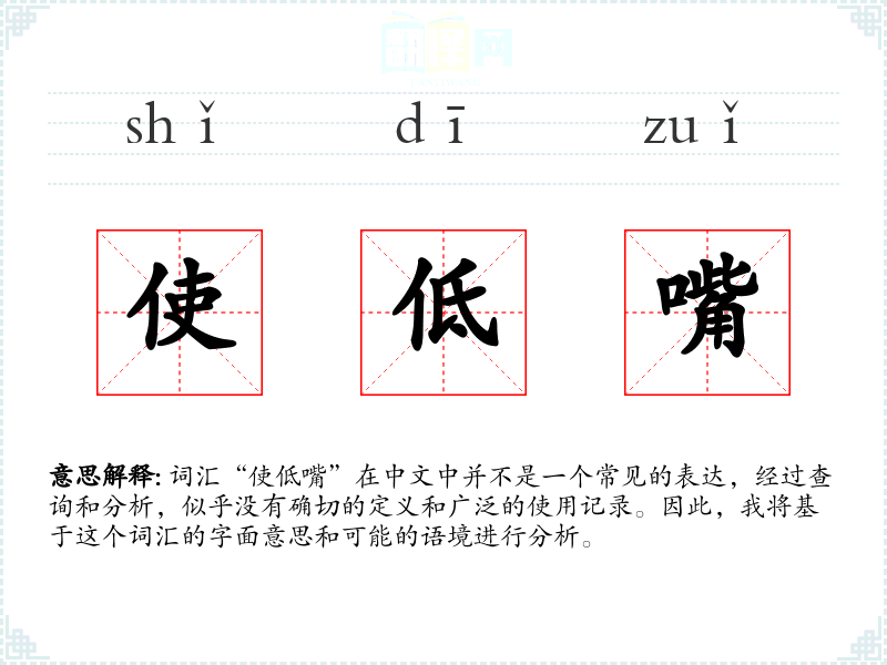 词汇“使低嘴”在中文中并不是一个常见的表达,经过查询和分析,似乎没有确切的定义和广泛的使用记录。因此,我将基于这个词汇的字面意思和可能的语境进行分析。