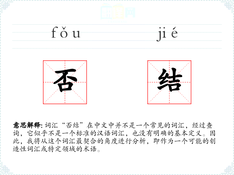 由于“否结”不是一个标准词汇,我们无法给出确切的基本定义。但从字面上理解,“否”通常表示否定或拒绝,“结”则可能指结合、结果或结构。结合起来,“否结”可能意味着拒绝结合或否定某种结果。