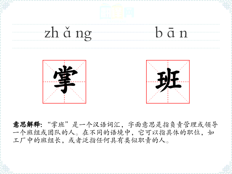 “掌班”是一个汉语词汇,字面意思是指负责管理或领导一个班组或团队的人。在不同的语境中,它可以指具体的职位,如工厂中的班组长,或者泛指任何具有类似职责的人。