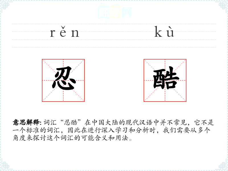词汇“忍酷”在*大陆的现代汉语中并不常见,它不是一个标准的词汇,因此在进行深入学和分析时,我们需要从多个角度来探讨这个词汇的可能含义和用法。
