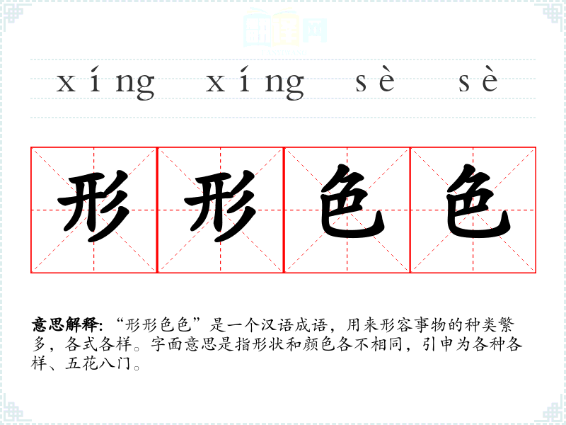 "形形色色"的意思解释、形形色色是什么意思由翻译网汉语词典查词提供。