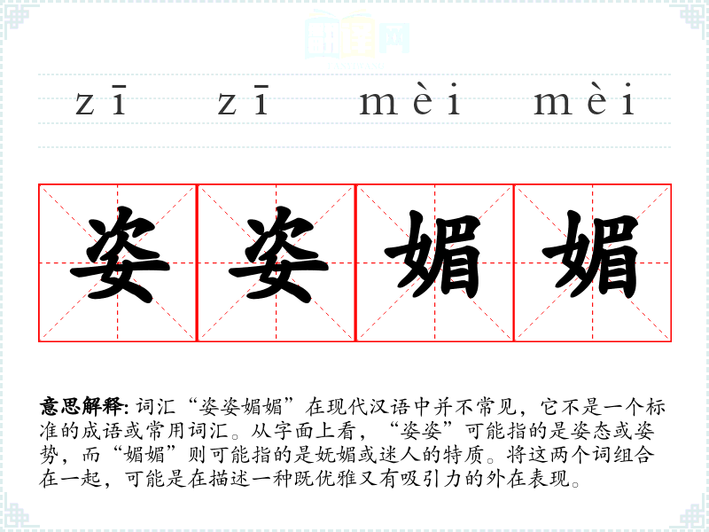 由于“姿姿媚媚”不是一个常用词汇,它在不同的语境中可能不太常见。在文学作品中,可能会用来形容女性的美丽和魅力,或者在描述艺术作品时,用来表达其优雅和吸引力。