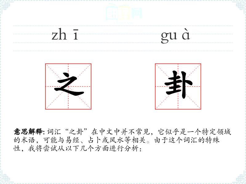 词汇“之卦”在中文中并不常见,它似乎是一个特定领域的术语,可能与易经、占卜或风水等相关。由于这个词汇的特殊性,我将尝试从以下几个方面进行分析: