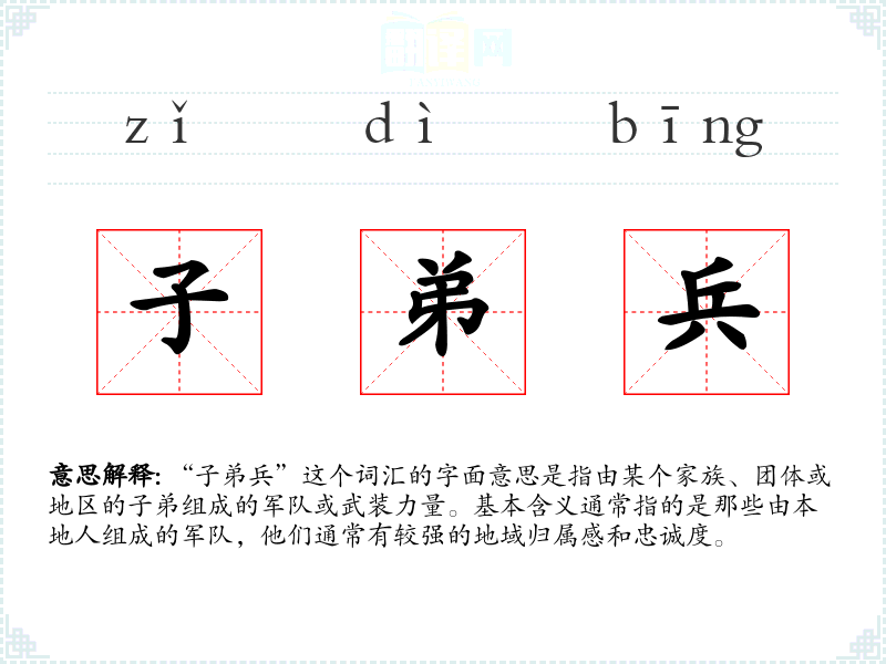 “子弟兵”这个词汇的字面意思是指由某个家族、团体或地区的子弟组成的军队或武装力量。基本含义通常指的是那些由本地人组成的军队,他们通常有较强的地域归属感和忠诚度。