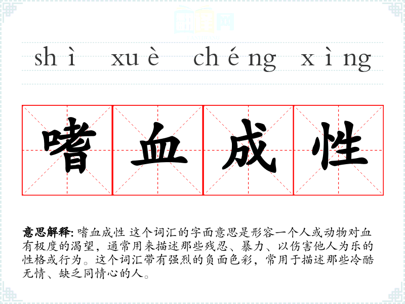 嗜血成性 这个词汇的字面意思是形容一个人或动物对血有极度的渴望,通常用来描述那些残忍、暴力、以伤害他人为乐的性格或行为。这个词汇带有强烈的负面色彩,常用于描述那些冷酷无情、缺乏同情心的人。