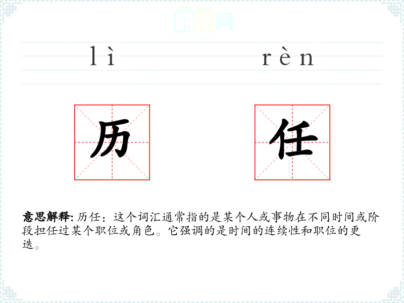 “历任”这个词在描述职位变动和历史沿革时非常有用,它不仅提供了时间上的连续性,也强调了职位的传承和历史的尊重。在学*语言和表达中,理解并正确使用“历任”可以增强我们对历史和社会的认识。