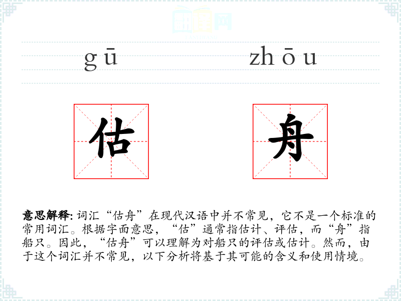 - 词源:“估”源自古代汉语,意为估计、评估;“舟”也是古代汉语,意为船只。