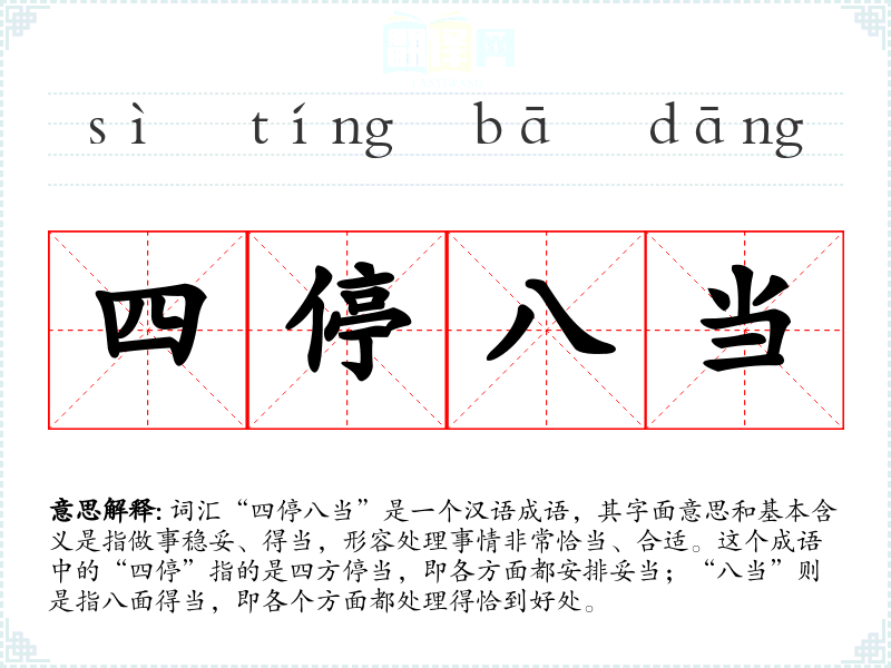 词汇“四停八当”是一个汉语成语,其字面意思和基本含义是指做事稳妥、得当,形容处理事情非常恰当、合适。这个成语中的“四停”指的是四方停当,即各方面都安排妥当;“八当”则是指八面得当,即各个方面都处理得恰到好处。