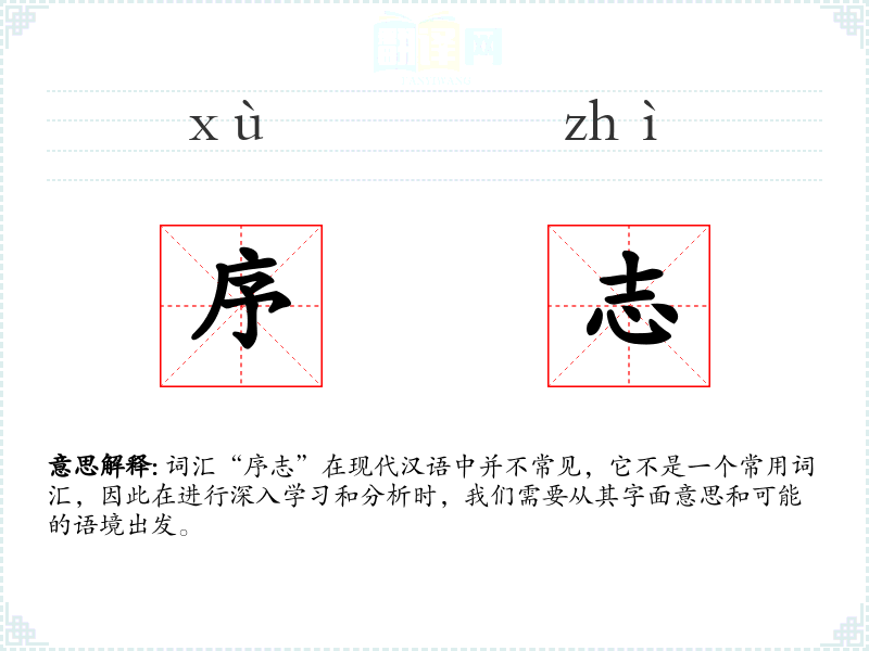 “序志”这个词可能是由“序”和“志”两个字组合而成,但在古代文献中并不常见。它的使用可能更多是现代人在特定语境下的创造性使用。