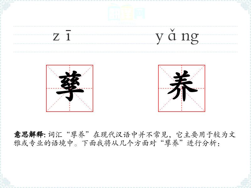 词汇“孳养”在现代汉语中并不常见,它主要用于较为文雅或专业的语境中。下面我将从几个方面对“孳养”进行分析: