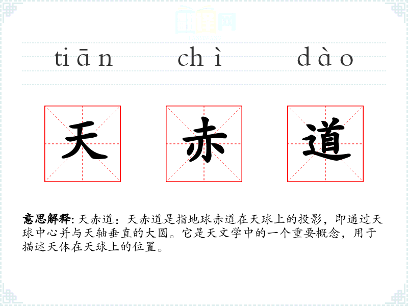 同义词:赤道天球、天球赤道 反义词:天极(天赤道的对立面,即天球的南北极)