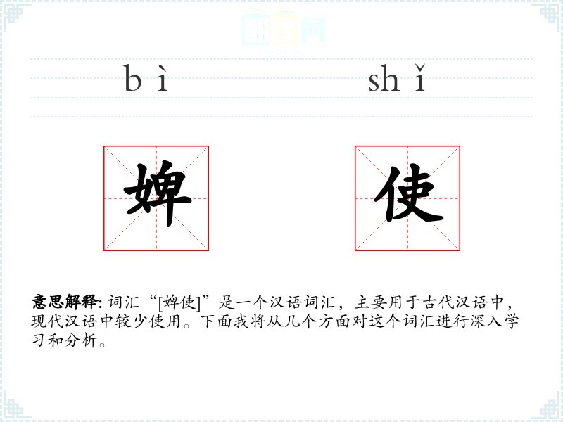 词汇“[婢使]”是一个汉语词汇,主要用于古代汉语中,现代汉语中较少使用。下面我将从几个方面对这个词汇进行深入学*和分析。