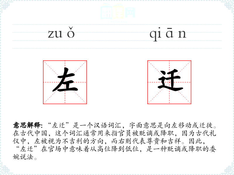 “左迁”是一个汉语词汇,字面意思是向左移动或迁徙。在古代**,这个词汇通常用来指官员被贬谪或降职,因为古代礼仪中,左被视为不吉利的方向,而右则代表尊贵和吉祥。因此,“左迁”在官场中意味着从高位降到低位,是一种贬谪或降职的委婉说法。