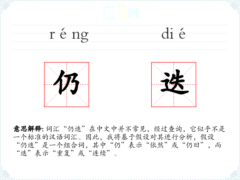 词汇“仍迭”在中文中并不常见,经过查询,它似乎不是一个标准的汉语词汇。因此,我将基于假设对其进行分析,假设“仍迭”是一个组合词,其中“仍”表示“依然”或“仍旧”,而“迭”表示“重复”或“连续”。