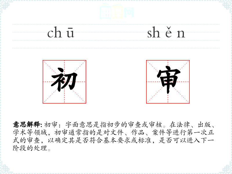 - 出版领域:在出版过程中,初审是编辑对投稿作品进行的第一次评估,以判断其是否符合出版标准,是否有进一步审阅的价值。