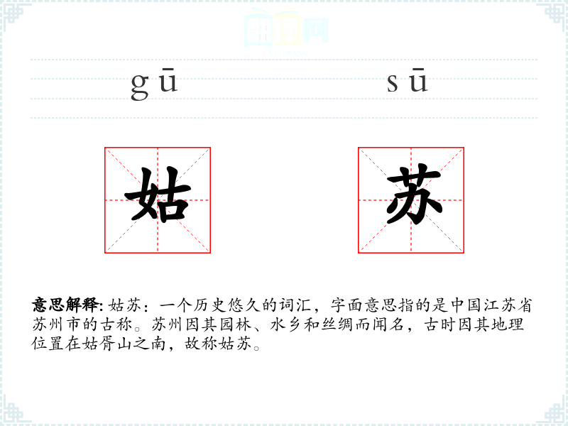 姑苏:一个历史悠久的词汇,字面意思指的是**江苏省苏州市的古称。苏州因其园林、水乡和丝绸而闻名,古时因其地理位置在姑胥山之南,故称姑苏。