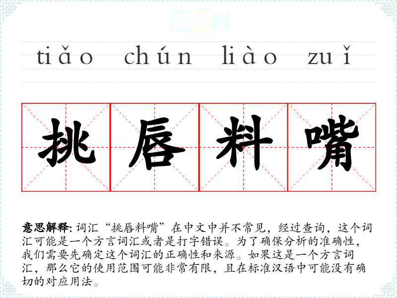 词汇“挑唇料嘴”在中文中并不常见,经过查询,这个词汇可能是一个方言词汇或者是打字错误。为了确保分析的准确性,我们需要先确定这个词汇的正确性和来源。如果这是一个方言词汇,那么它的使用范围可能非常有限,且在标准汉语中可能没有确切的对应用法。