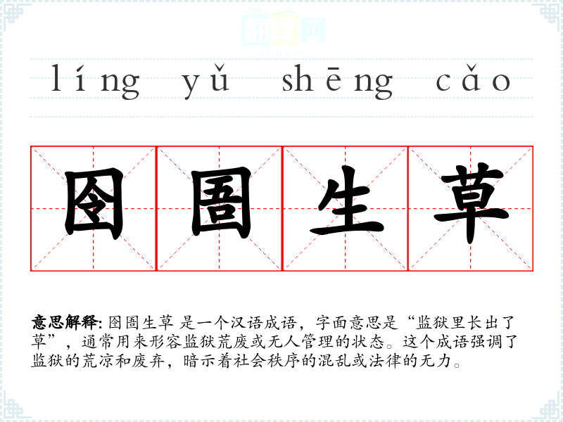囹圄生草 是一个汉语成语,字面意思是“监狱里长出了草”,通常用来形容监狱荒废或无人管理的状态。这个成语强调了监狱的荒凉和废弃,暗示着社会秩序的混乱或法律的无力。