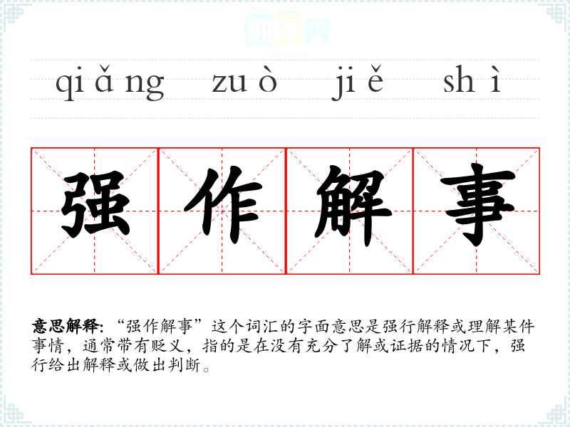 “强作解事”这个词汇的字面意思是强行解释或理解某件事情,通常带有贬义,指的是在没有充分了解或证据的情况下,强行给出解释或做出判断。