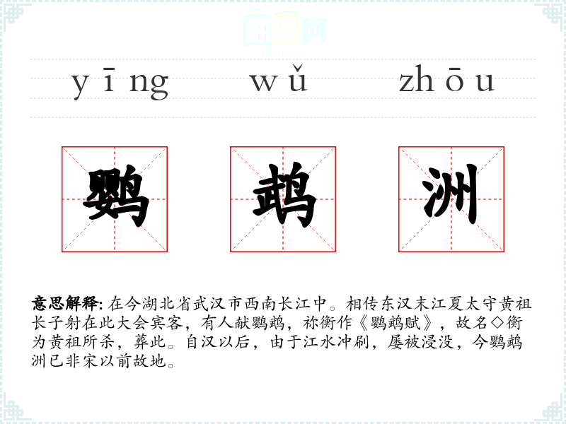 在今湖北省武汉市西南长江中。相传东汉末江夏太守黄祖长子射在此大会宾客,有人献鹦鹉,祢衡作《鹦鹉赋》,故名◇衡为黄祖所杀,葬此。自汉以后,由于江水冲刷,屡被浸没,今鹦鹉洲已非宋以前故地。