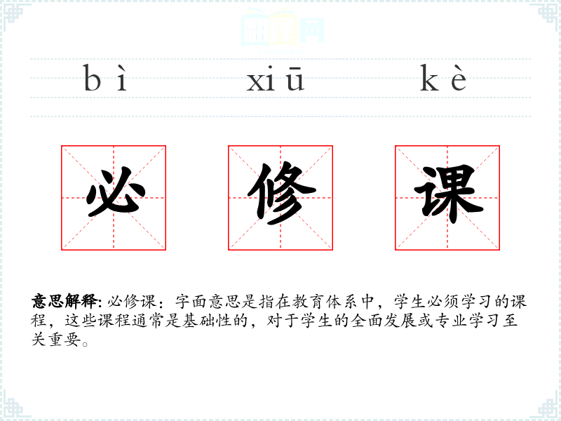 必修课:字面意思是指在教育体系中,学生必须学习的课程,这些课程通常是基础性的,对于学生的全面发展或专业学习至关重要。