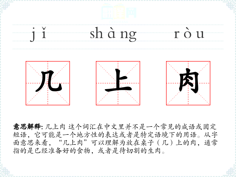由于“几上肉”不是一个广泛使用的词汇,它的使用语境可能非常有限。在某些地方方言或特定社群中,它可能用来描述餐桌上摆放的肉类食物,或者是在厨房中准备过程中的肉类。