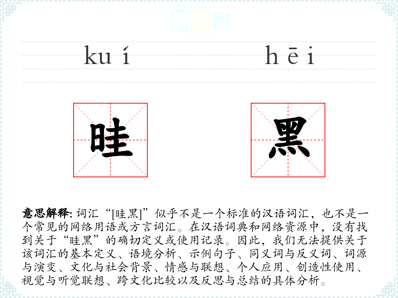 词汇“[晆黑]”似乎不是一个标准的汉语词汇,也不是一个常见的网络用语或方言词汇。在汉语词典和网络资源中,没有找到关于“晆黑”的确切定义或使用记录。因此,我们无法提供关于该词汇的基本定义、语境分析、示例句子、同义词与反义词、词源与演变、文化与社会背景、情感与联想、个人应用、创造性使用、视觉与听觉联想、跨文化比较以及反思与总结的具体分析。