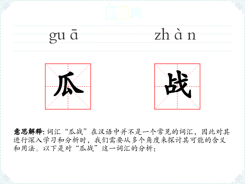 词汇“瓜战”在汉语中并不是一个常见的词汇,因此对其进行深入学习和分析时,我们需要从多个角度来探讨其可能的含义和用法。以下是对“瓜战”这一词汇的分析: