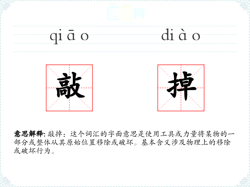 敲掉:这个词汇的字面意思是使用工具或力量将某物的一部分或整体从其原始位置移除或破坏。基本含义涉及物理上的移除或破坏行为。