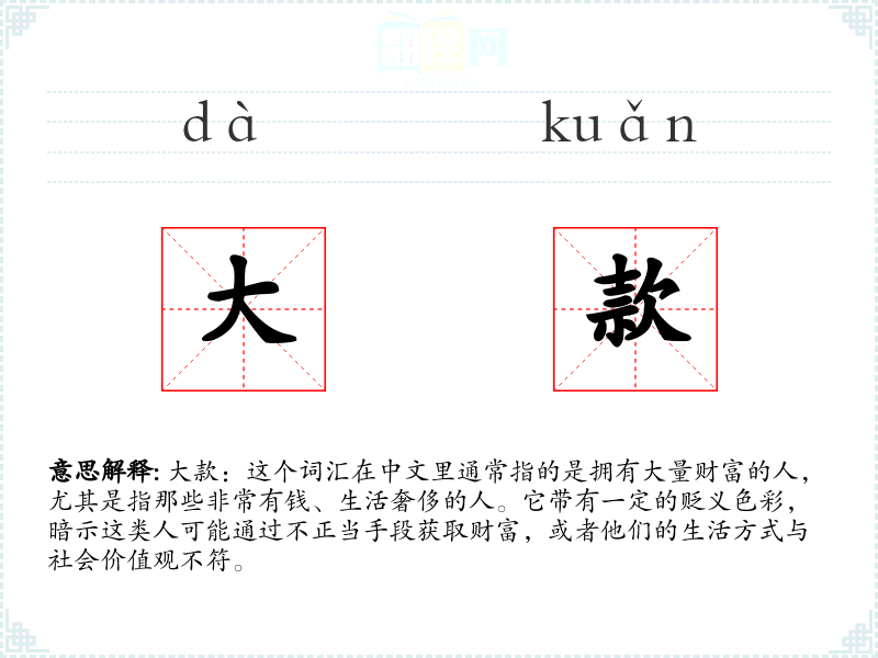 大款:这个词汇在中文里通常指的是拥有大量财富的人,尤其是指那些非常有钱、生活奢侈的人。它带有一定的贬义色彩,暗示这类人可能通过不正当手段获取财富,或者他们的生活方式与社会价值观不符。