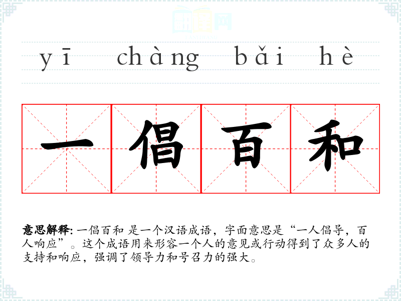 一倡百和 是一个汉语成语,字面意思是“一人倡导,百人响应”。这个成语用来形容一个人的意见或行动得到了众多人的支持和响应,强调了领导力和号召力的强大。