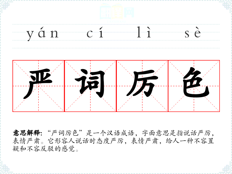 “严词厉色”是一个汉语成语,字面意思是指说话严厉,表情严肃。它形容人说话时态度严厉,表情严肃,给人一种不容置疑和不容反驳的感觉。