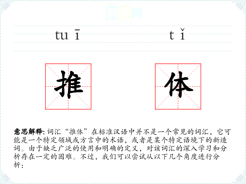 由于“推体”不是一个标准词汇,个人可能很少有机会在日常生活中遇到或使用该词汇。