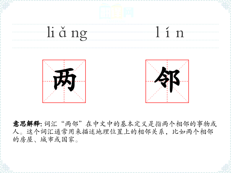 词汇“两邻”在中文中的基本定义是指两个相邻的事物或人。这个词汇通常用来描述地理位置上的相邻关系,比如两个相邻的房屋、城市或国家。