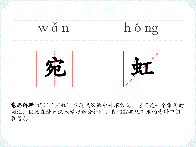 词汇“宛虹”在现代汉语中并不常见,它不是一个常用的词汇,因此在进行深入学习和分析时,我们需要从有限的资料中提取信息。