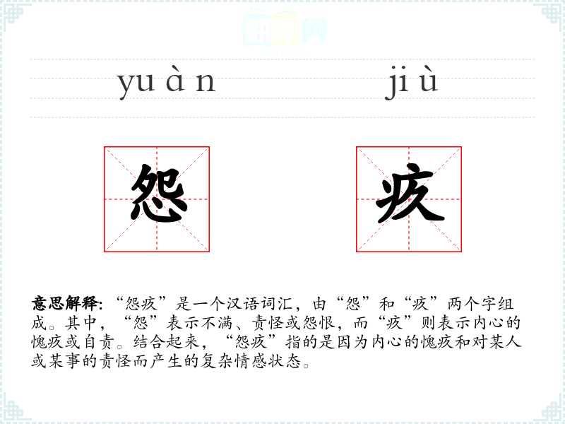 “怨”字最早见于甲骨文,原意为怨恨、不满。“疚”字则较晚出现,原意为内心的痛苦或愧疚。两个字结合成“怨疚”,可能是随着汉语的发展,人们需要更精确地表达复杂的情感状态而形成的词汇。
