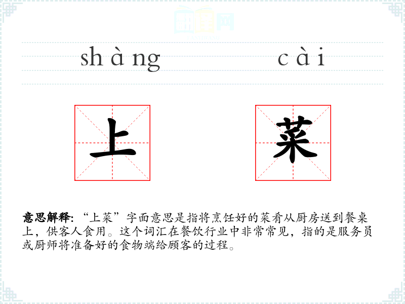 "上菜"的意思解释、上菜是什么意思由翻译网汉语词典查词提供。