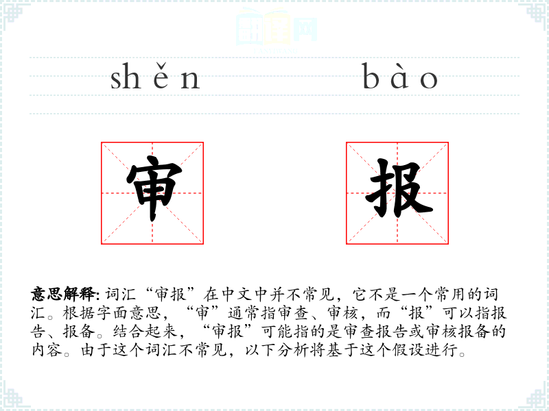 词汇“审报”在中文中并不常见,它不是一个常用的词汇。根据字面意思,“审”通常指审查、审核,而“报”可以指报告、报备。结合起来,“审报”可能指的是审查报告或审核报备的内容。由于这个词汇不常见,以下分析将基于这个假设进行。
