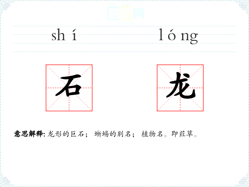 龙形的巨石; 蜥蜴的别名; 植物名。即荭草。