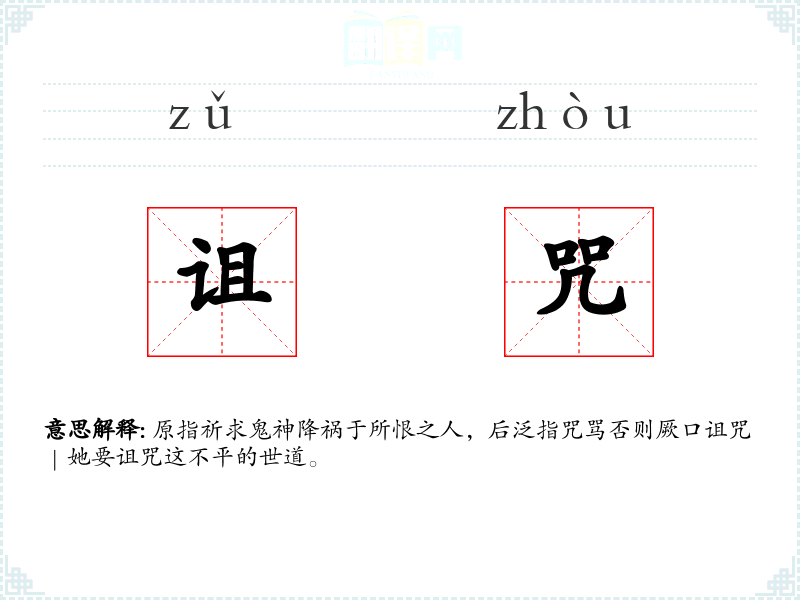 原指祈求鬼神降祸于所恨之人,后泛指咒骂否则厥口诅咒|她要诅咒这不平的世道。