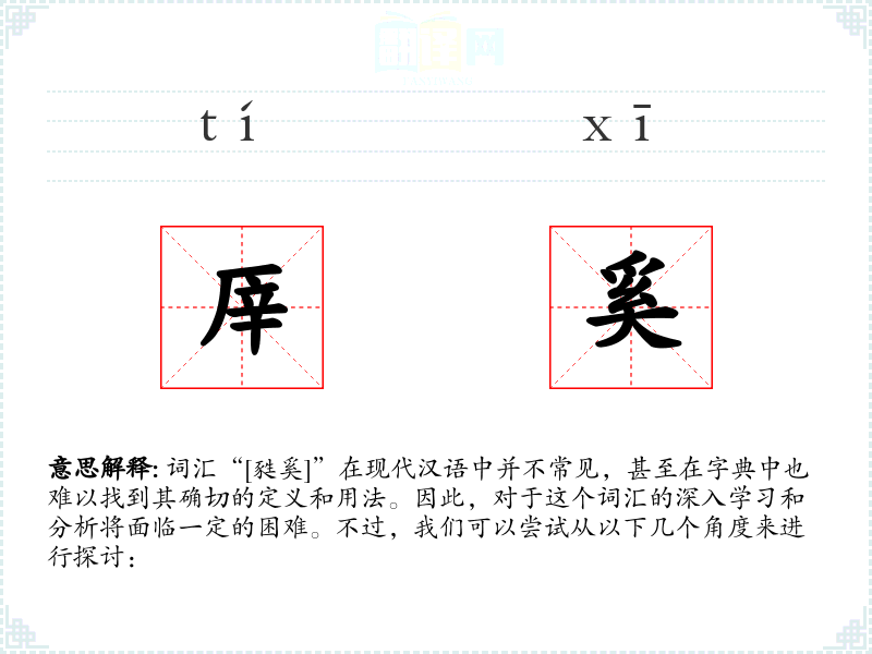 词汇“[甤奚]”在现代汉语中并不常见,甚至在字典中也难以找到其确切的定义和用法。因此,对于这个词汇的深入学习和分析将面临一定的困难。不过,我们可以尝试从以下几个角度来进行探讨: