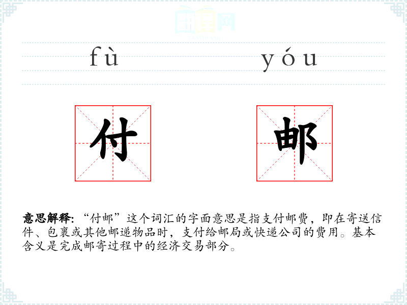 - 专业领域:在邮政或快递行业,“付邮”是一个常用术语,用于描述客户支付邮费的行为。